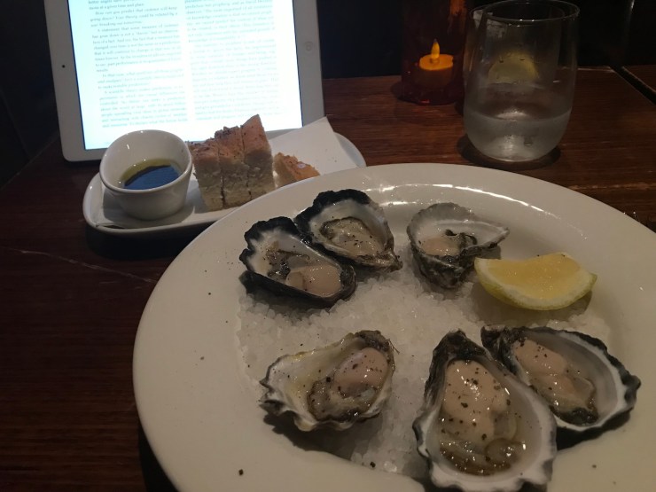 I had a 1/2 dozen oysters and they were phenomenal. Meaty and very flavorful. For my main, I had lamb chops which were also lovely and perfectly prepared. I read the paper and enjoyed the meal immensely. I will be back before I leave.