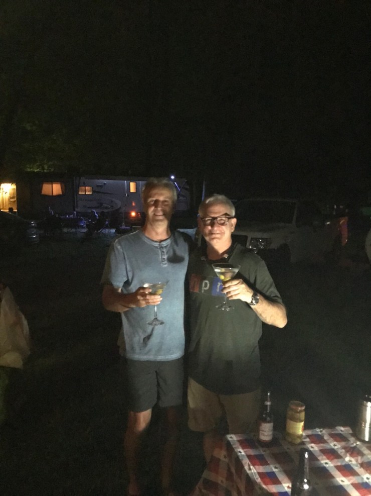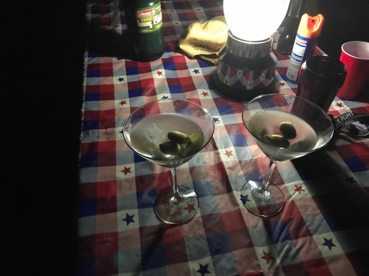 We were camping on Mother’s Day weekend with Martin & Pam, Larry, Rita and me. It was nearly 10:00 by the time we got camp set up and were able to fire the martini’s but we got her done. Ketel One with jalapeno olives.