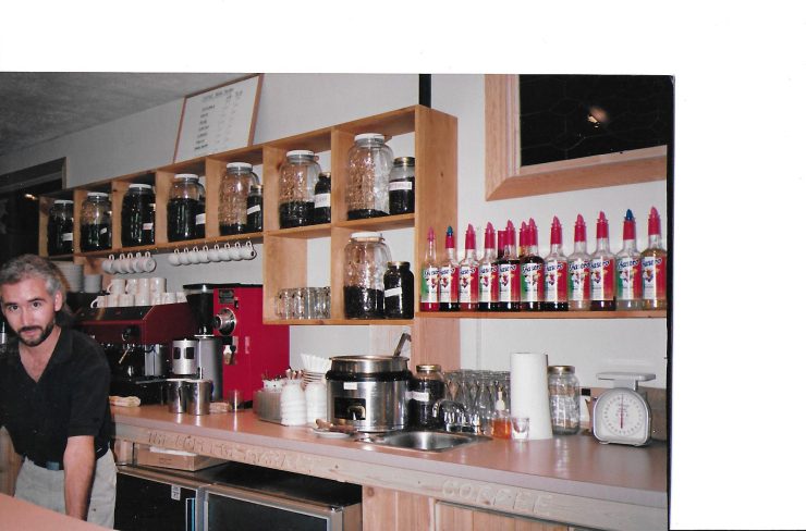 I visited multiple bookstores and coffeeshops in the pacific northwest over that year. I found many owners willing to assist but most of my information came from Jon Bolton at the amazing Salt Lake Roasting Company and my friend Shanna Wroten, who at that time was working for Jerome Eberharder at Moxie Java in Boise. The beautiful Carla Green left B. Dalton Booksellers to come run the bookstore side of the business for me so I could focus on coffee and pastry. John Goddard, best damn bartender in the northern hemisphere came to work for me. We served up coffee in the mornings and rode mountain bikes all afternoon. Kelly Green and Maureen Farrell also came to work for us. Pete Cook, lead singer and guitar player in Center Street Reggae, the house band at First National Bar, wrote my point-of-sale program from scratch. Jeff Klinger spent the entire summer with me, working 12 hour days 7-days a week to be ready to open by October. Jack Webber did much of the interior carpentry. We knocked out a huge swath of the front of the building to put in windows and let in light. When a warehouse burned down a few blocks away, we were there next morning, while smoke was still rising from the ashes, to buy up used bricks for the outdoor patio. It was an amazing collaborative effort. I bought a bunch of hardwood from the school district when they replaced an elementary school gymnasium and that was what we used for the elevated eating platform. Dennis Proksa, owner and artist at Blackrock Forge made some beautiful railings. We won an award from the city for the most beautiful retail outdoor landscape that first year.