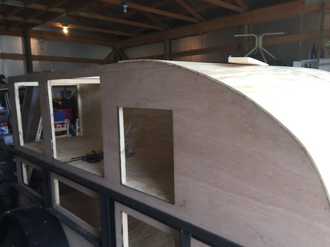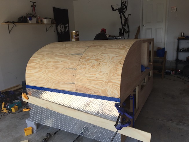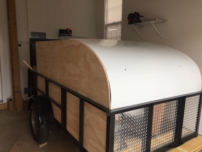 I built a mock-up myself first, which was fine. It was essentially just the exterior to prove out the shape and basic design. I was working from a loose set of requirements that included: lightweight (under 1,600 lbs unloaded), big outdoor kitchen area, slide out for cook stove, and flat roof where a tent would be mounted on top and accessed via a ladder. I bought marine grade plywood for the exterior and it was covered with epoxy for additional moisture protection. The top was covered with a thin sheet of aluminum. The whole thing was mounted onto a 5′ x 10′ utility trailer.
