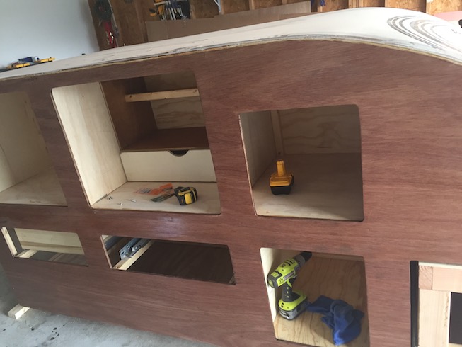 I knew I would need some help for the more tricky bits like the drawers and interior infrastructure so I transported the early mock-up and materials to Somerset to Shannon’s garage. I hired a guy named Rick who showed up once and did not show up 7 times. A true-blue, hard-core limp dick. Decent carpenter but completely unreliable. Then came Willy. Same thing. Willy would turn up as scheduled on a Friday afternoon, and promise to be back Saturday morning and not show up again for two weeks. After losing around 3 months with those two LD’s I moved the operation back to my garage and found a local guy who was more reliable. Not completely reliable; it still took us another 3 months to finish, working evenings after work and weekends, but we finally got her mostly finished up by late July.