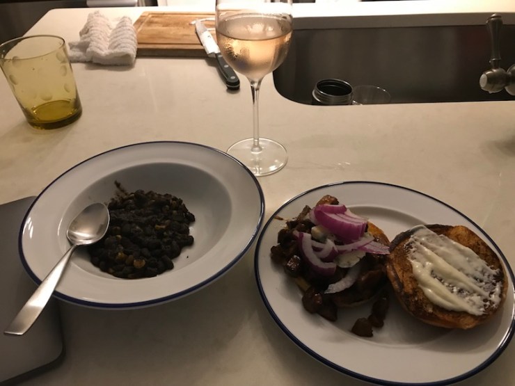 So tonight, I had the rest of the ribeye with the black beans. I cut the ribeye into small pieces and sauteed’ in a cast iron skillet with some spicy barbeque sauce. I put that on a toasted brioche bun with horseradish sauce, amazing French blue cheese and thinly sliced red onions. Un-fucking believable. Lovely. Amazing. With a nice Sancerre Rose’ and the rest of the black beans.