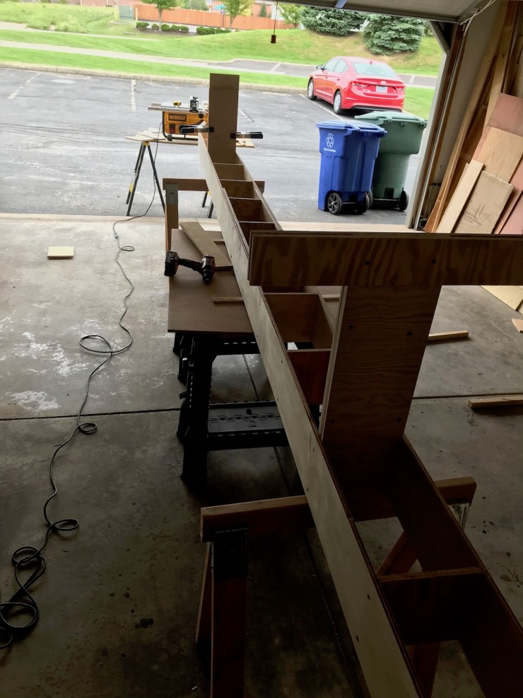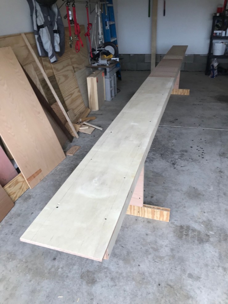 Yesterday I got the strongback assembled. I used 1/2” plywood when 3/4″ is recommended. I can see how the extra weight would be advantageous but I had so much 1/2″ material lying around that I want to get rid of that I just went with it. I had to extend my top by an extra 6” on either end since I am building a 17’ canoe and the sides by and extra 1” to compensate for the thinner construction material. I took my time and when finished it came out pretty damn level. Not perfect, but not bad. I think my garage slopes a bit but I can correct that with shims.