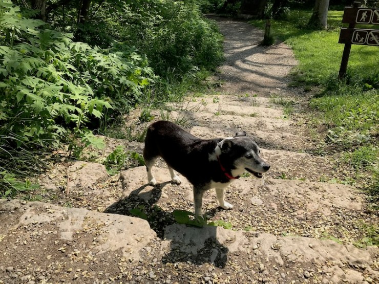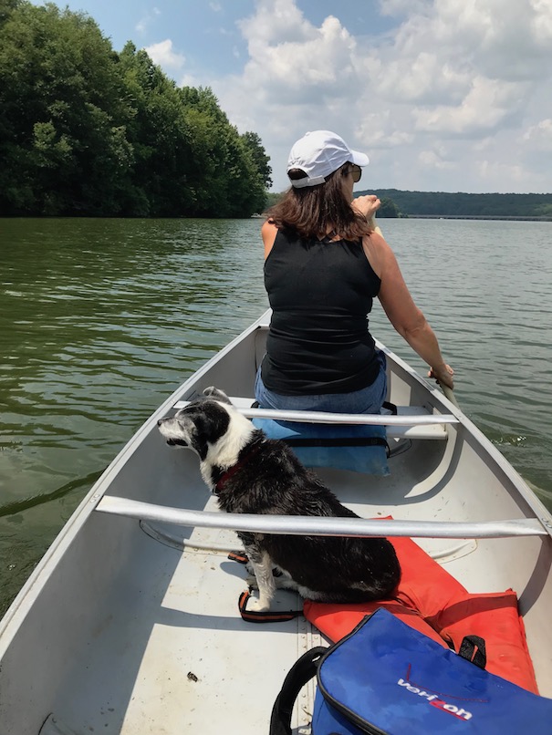 Now I find myself thinking about where she would be if she were here. Sitting by the patio door probably, when I am reading or writing, where she can see me and still look outside. In Columbus, when I was in the garage working on the canoe or camper or some other project, she would lie half in the garage and half outside on the driveway. Again, so she could keep an eye on me and also at what was happening in the park.