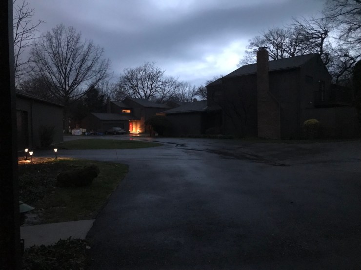 The rain is coming hard now. It’s nice and cozy, sitting in the garage listening and looking out on the rain.