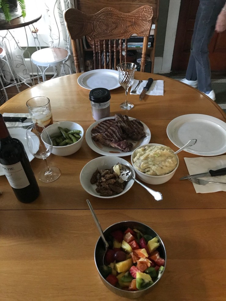 I headed down Saturday and had a nice dinner with mom and dad of buffalo steaks, potatoes and sugar snap peas. Shannon turned up and we played some euchre. Nice evening.