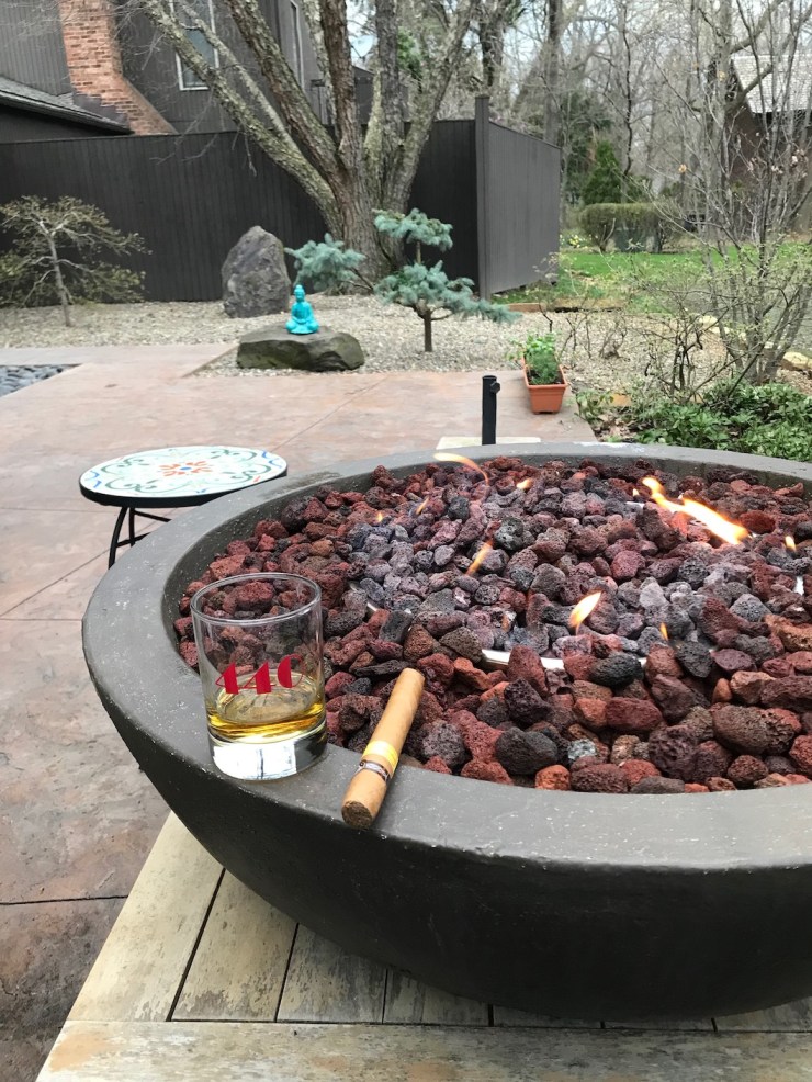 I am now back at my new few favorite place on the planet—the lovely patio behind my house. Sitting by the fire pit enjoying a DR Monte Christo and a glass of 10-year old Laphroig.
