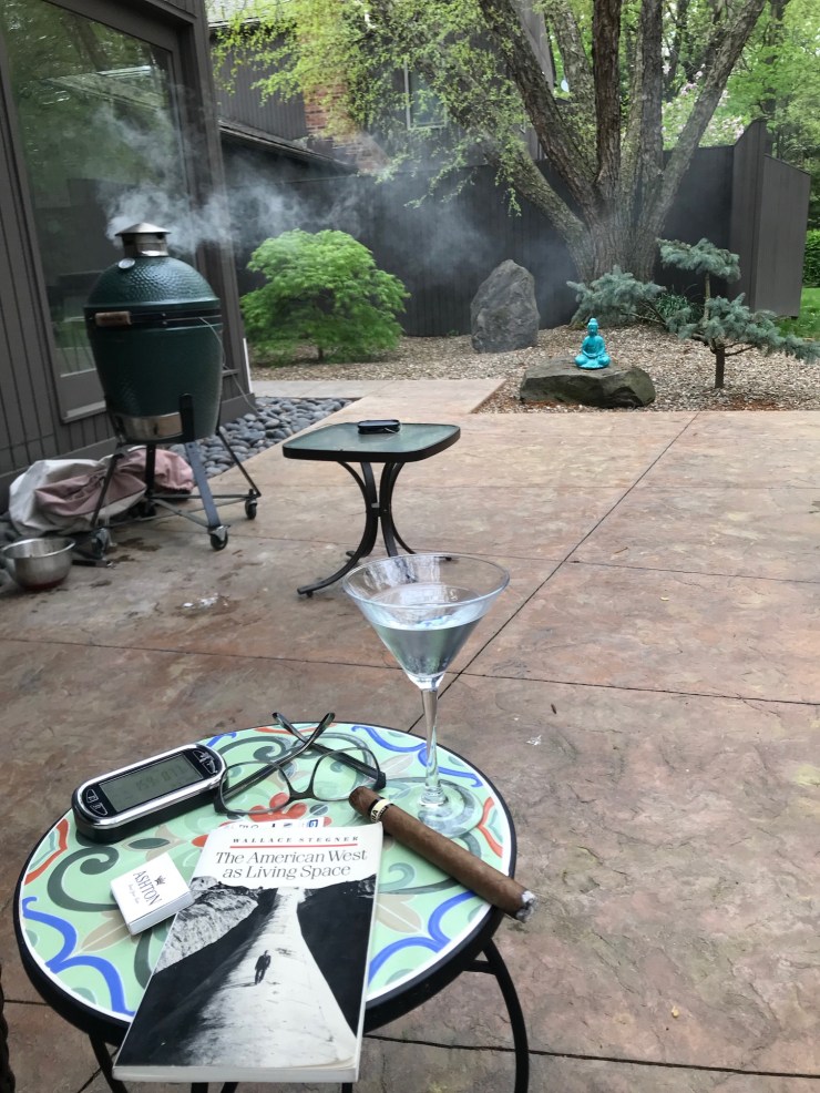 A superb night at home with my Big Green Egg and a lovely Bombay Sapphire martini. Two in fact. Sitting on the deck. Weather has finally come around to something resembling spring. I read Stegner while looking after the smoker–a nice big salmon fillet to take to mom and dad’s tomorrow and some chicken that I had brined overnignht in pickle juice and chipolte.