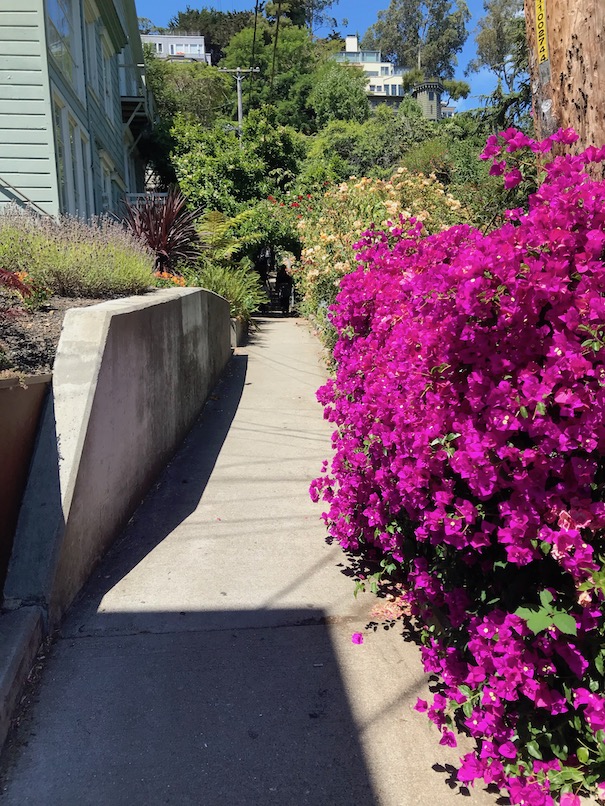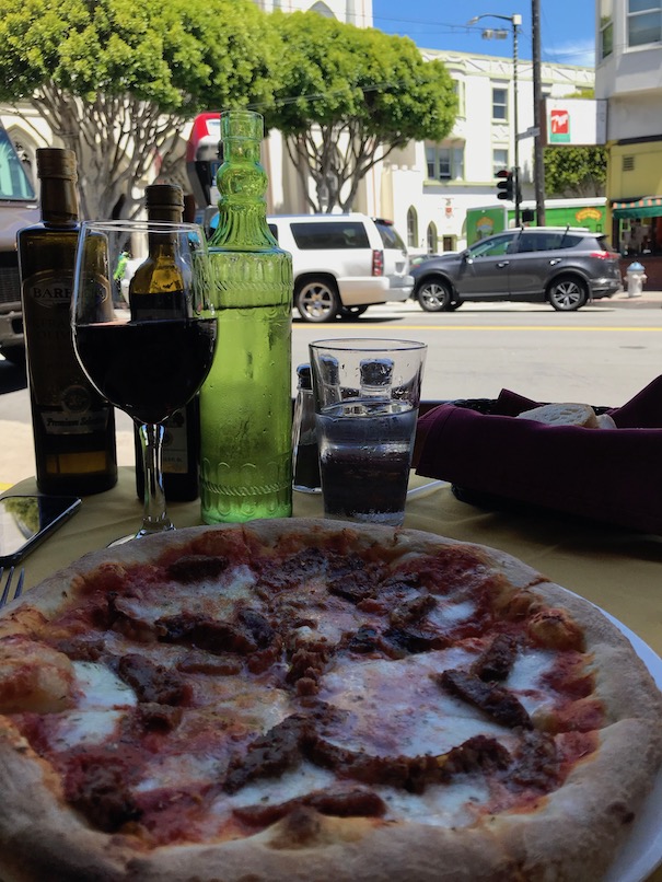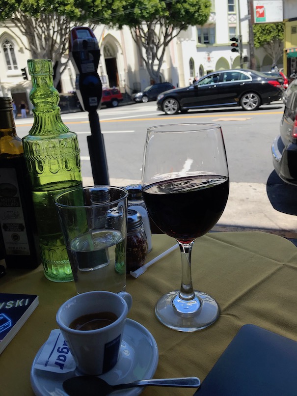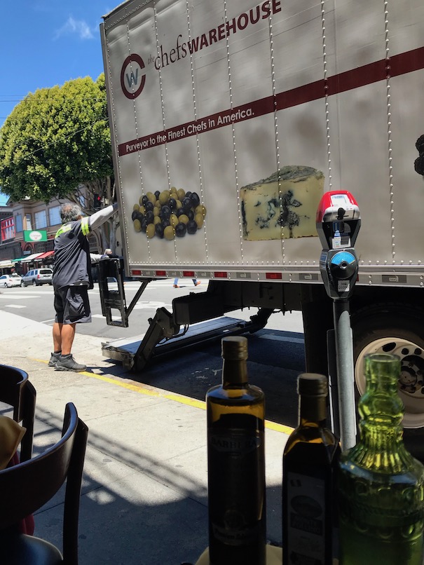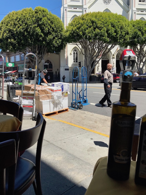After visiting City Lights I had a beautiful Italian lunch with wine, grappa, and espresso. I started reading Post Office but mostly people-watched. I chose an outdoor table that had a view of a beautiful church, but I was there during prime food delivery time and the delivery trucks parked directly in front of me. So mostly I watched men unpacking and delivering food. The first truck was ItaliaFoods, followed then by Sysco, UPS, and then Chef’s Warehouse. The ItaliaFoods truck was delivering to several restaurants on that block and there were 3 guys. One was clearly in charge as he was pointing and barking out orders. He was chatting with one of other delivery company guys and at one point said “we’re on the front lines brother—if not for us, people go hungry in this city”.