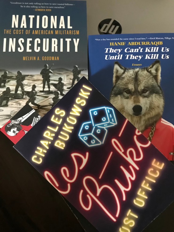 On this trip I bought ’Post Office’ by Bukowski—which I have surprisingly never read because I thought I had covered all the ground with him. ‘They Can’t Kill Us Until They Kill Us’ by Hanif Abdurraqib and ‘National Insecurity’ by Melvin Goodman. All different and all look good. So will add those the massive pile of books awaiting my time and attention.