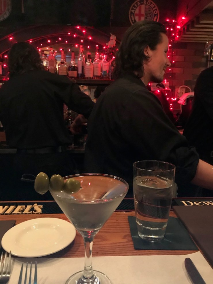 I stayed with the always reliable Ketel One with olives. For dinner, I had mushroom and truffle ravioli with a nice marinara. Scallops for starter which were amazing. The cooking window for scallops is always narrow, but these were perfect. Blackened and seared, but soft and moist and delicious inside. Then a really terrific chocolate gelato for dessert with Oman 14 scotch.