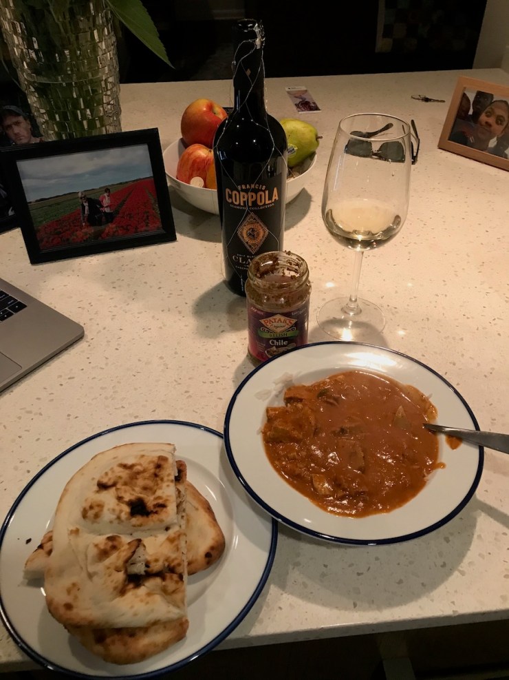 I made some killer butter chicken tonight, without the chicken. Still cutting back a bit on meat–not quitting, just more aware and thoughtful about how often and what kinds of meat to indulge in. Anyway, a nice challenge. I just followed the recipe but added roasted cauliflower and a little tofu. And it was fucking amazing. And I am seriously ‘crack-like’ addicted to the spicy green pickle relish from India. I fucking love that shit. So I had all that with Naan and basmati rice. Nice Monday evening meal and some in the freezer for another day.