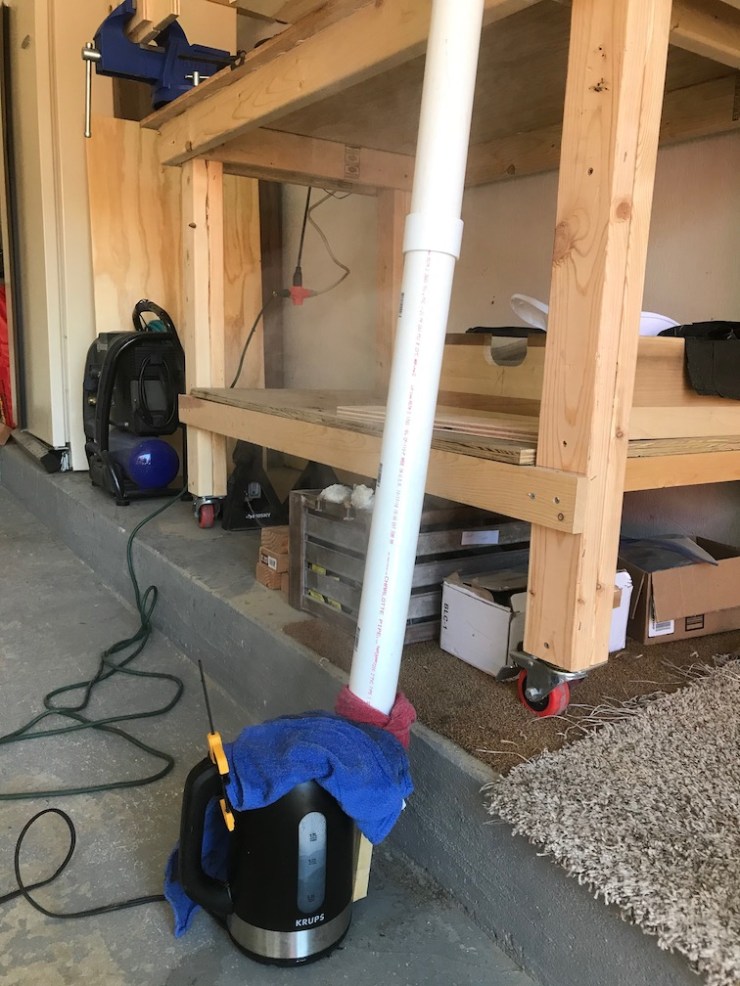 Slow but steady progress on canoe building. Saturday I got the strongback out and leveled. After two trips to Home Depot, I got the bow and stern stem molds cut and the holes drilled for clamps to hold the stem pieces. I got the bow and stern stems bent and clamped on—I had to re-purpose my hot water kettle to fashion a steam bending device, but it worked perfectly. I got all the station mold blocks in place.