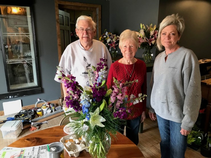 I brought home some amazing flowers from Terri’s shop and a lovely painting Rick made for me for my birthday. The sibs and mom and dad chipped in to get it for me. It’s a painting of the farm, just off the side of the house looking up at the corn crib and barn and butcher shop. Rick knows I dig cows, so he painted in a couple cows where there would not normally be a cow in that scene.