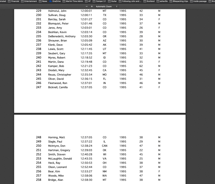 Another movie about the Leadville Trail 100 came out and I watched the trailer—it’s called Victory Lap. This one highlights a woman from Sun Valley and a man from Jackson on their journey through that amazing experience. That made me dig around once again to find my time when I did it in 95’. Maybe in 2025, I’ll do it 30 years after the first time. Or maybe not. I was very slow–finishing in over 12 hours. But finish I did, and not quite dead last. 500 started and 258 finished. I was 240.
