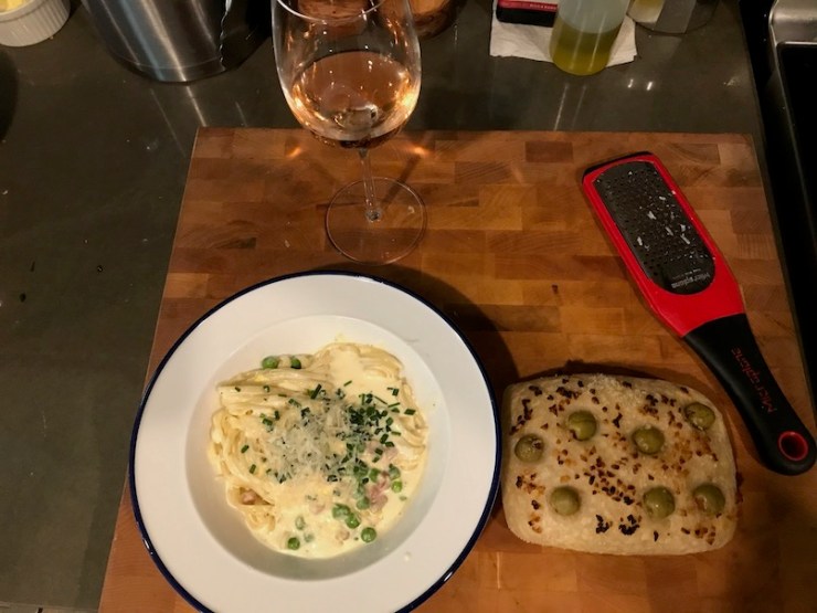 I did ride the motorycle the couple of miles down the road to the little bistro at 55th street pier, but they are all masked up and following all the precautions. There I had a beer and then came back home for a proper martini (forgot to get the picture) and some killer carbonara with pancetta and peas and homemade salt bread. I added a little garlic and some green olives to the bread because that’s just the way I roll.