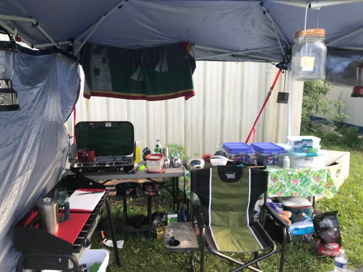 I arrived here last Friday and set up camp outside the building we are renting. I have a blow up mattress and small office inside but I take my meals and relaxation out here under the tarp. I have a campfire every night which is pretty fucking sweet. I do my work-work during business hours and am in the shop early morning and after hours. I will bounce back and forth for a time, between here and mom and dad’s place.