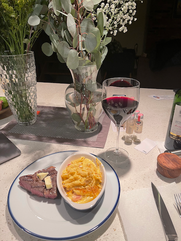 killer mac-n-cheese with a rib-eyed cooked in sous vide