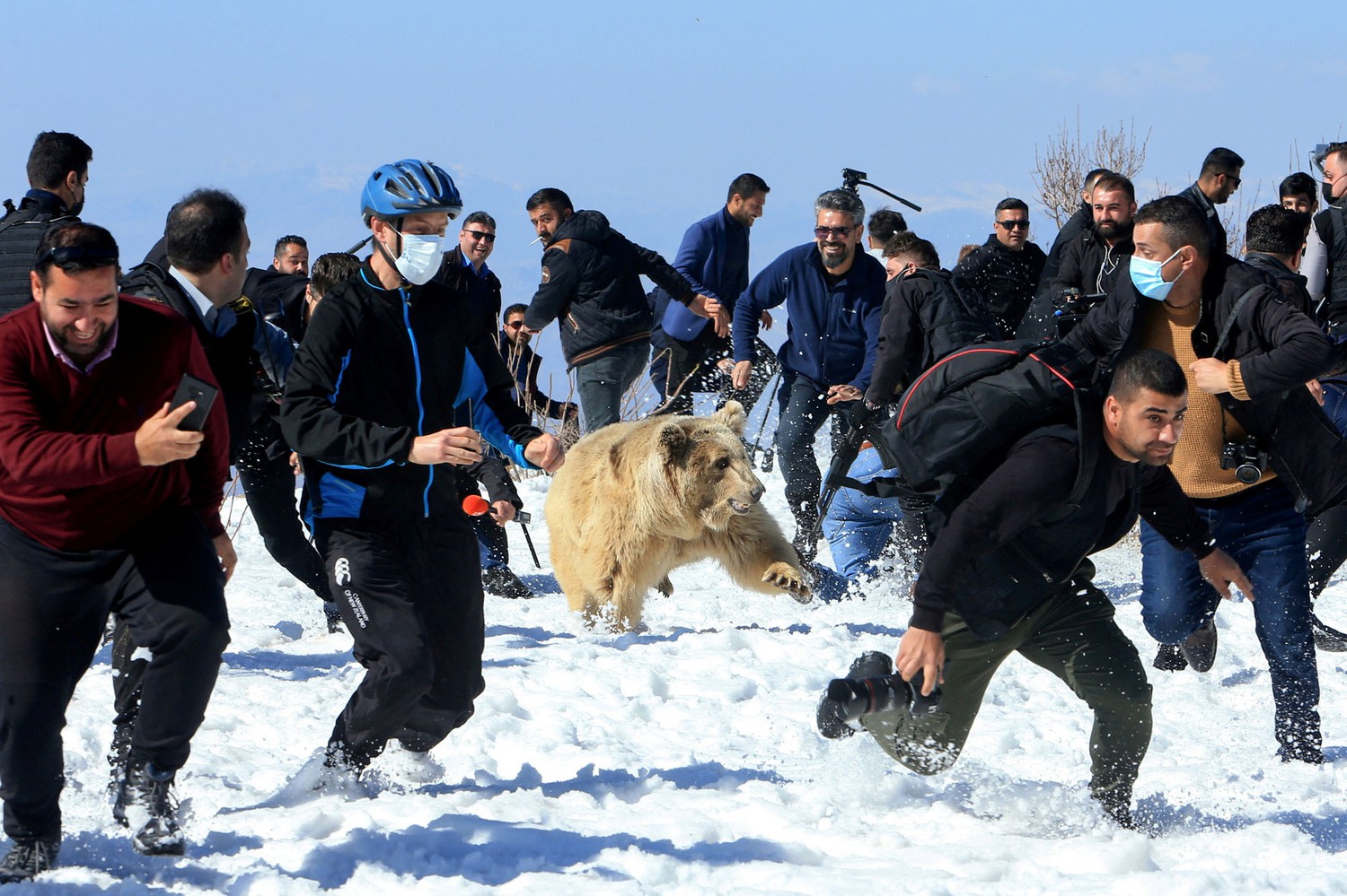 People and security members run away as Kurdish animal rights activists release a bear into the wild after rescuing bears from captivity in people homes, in Dohuk, Iraq February 11, 2021. REUTERS/Ari Jalal TPX IMAGES OF THE DAY