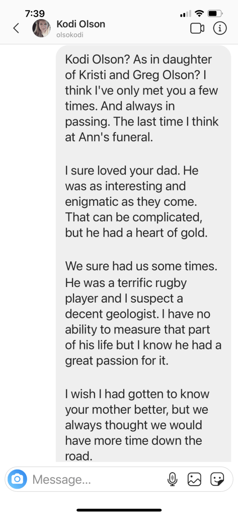 Funny about social media. Once in a while I get a request from a name that is vaguely familiar, but I’m not quite sure who it is. Tonight it was from Greg Olson’s daughter, Kodi. I think I’ve met Kodi only once or twice and both times at funerals. She was born after our heydays of rugby in Idaho. But of course our networks overlap due to rugby and she sent me a friend request on Instagram.
