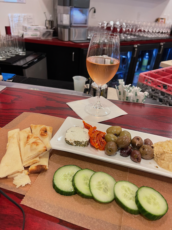 I had a glass of Rosé in the airport at Vino Volo along with a hummus platter. On the plane I had a white wine and a scotch. I was in business class for all flights since there is still so little demand.