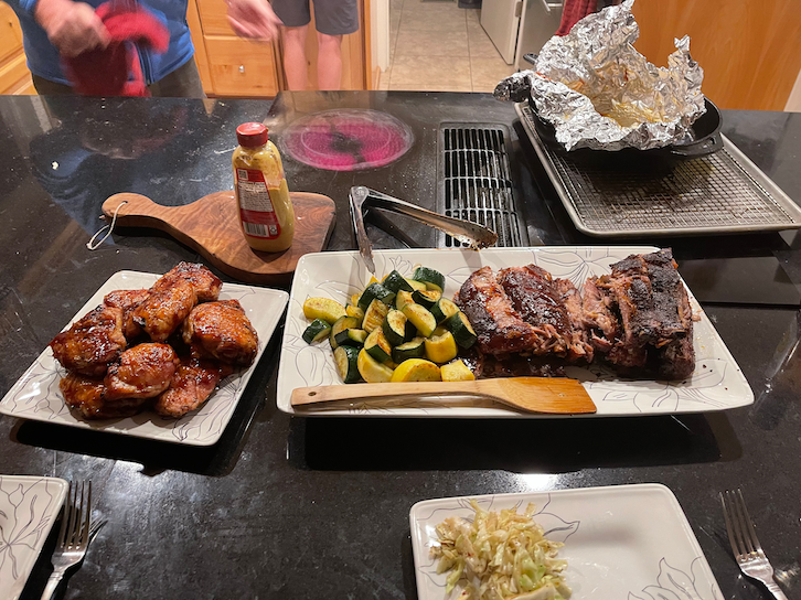 Shane and Tekoa live in a beautiful house high above the city with an amazing back yard. So we hung out there. We had a martini and then a moscow mule and wine with dinner. Shane is a solid cook and made smoked chicken thighs and ribs 2 ways and roasted vegetables.