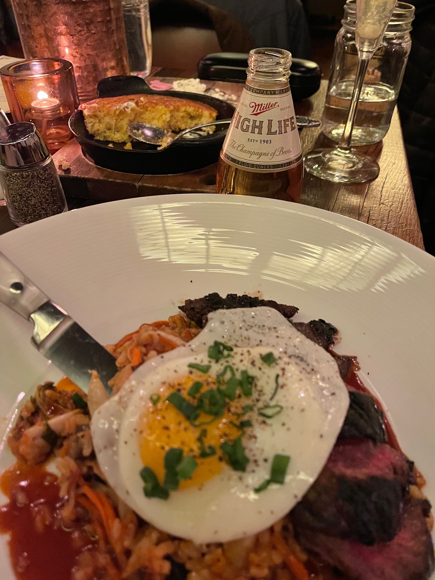 Brittany and I put in an epic day-drinking game plan on Super Bowl Sunday. Super bowl was completely incidental. We started at 9:00am at Fado to watch rugby. Then headed downtown to the Pearl for an excellent brunch. We had NOLA style charbroiled oysters for a starter. Brittany had a gourmet grilled cheese and I had hangar steak with eggs and skillet cornbread. My meal came with the cutest little 7-oz Miller High Life you’ve ever seen. A single gulp of beer really, but beautifully presented.