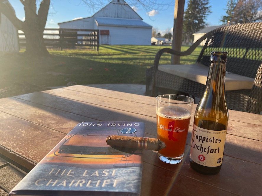 I’m now on the back patio. With Belgium Trappists beer and a cigar and John Irving. I’ve been reading Irving now for 35 years or so I would guess. I think I’ve read everything he’s written. He’s a fav. Beautiful developer of characters and teller of complex stories of human interaction. This book, his latest, called ‘The Last Chairlift’, feels like a Swansong. I think John is over 80 now. The hardcover is beautifully printed on thin, expensive paper. Perhaps a tribute to the man who has brought so much enjoyment to so many over all these years.