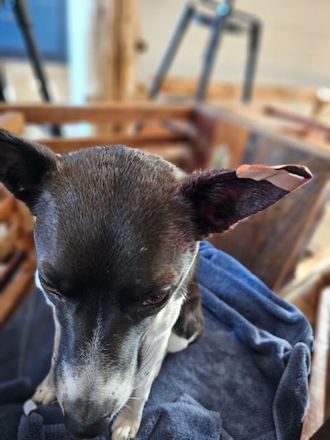 Marti got into a little scrap with a 17-year old, 10-lb dog that was blind and deaf and she still managed to get the worst of it — so we had to band-aid her ear. A blow to her ego more than anything I think.