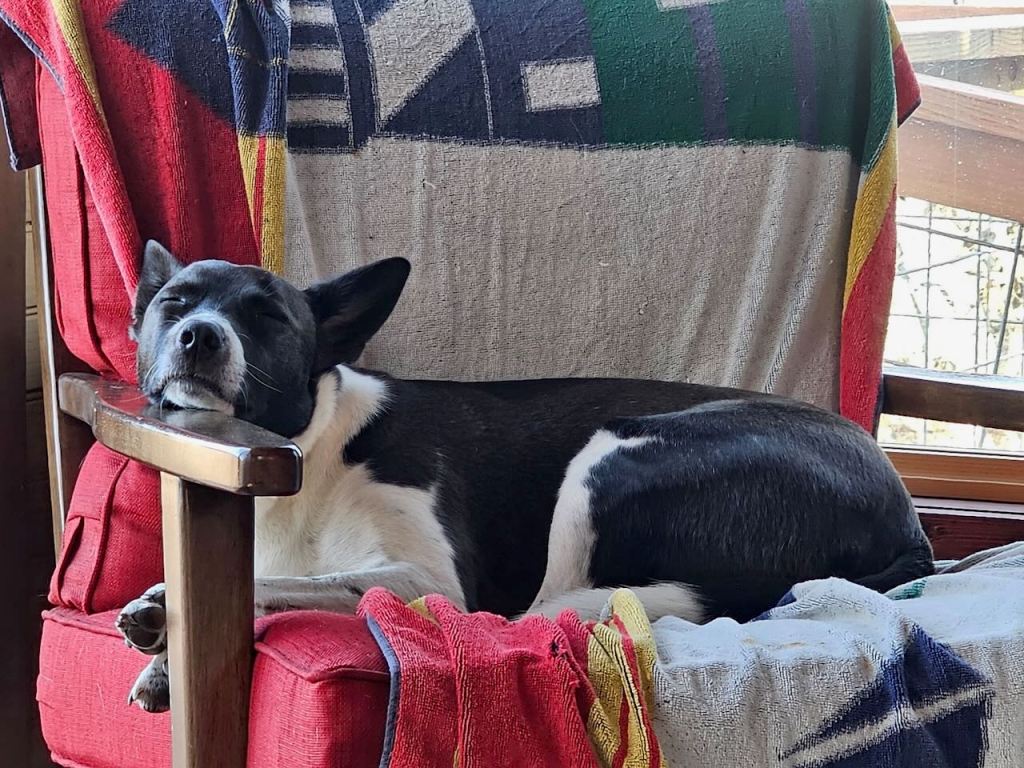 Twice a day Marti and I walk the 2.5 miles down to the bottom of the hill, along the creek. She stops to cool off and get a drink 1/2 way and I take a little rest. At home, Marti sits in her chair, perfectly positioned so she can see most of the house and keep and eye on me and Brittany. I sit opposite when I read, where I can watch Marti and also with a good view of the river and mountains across the valley.