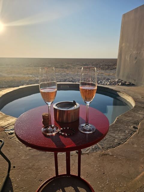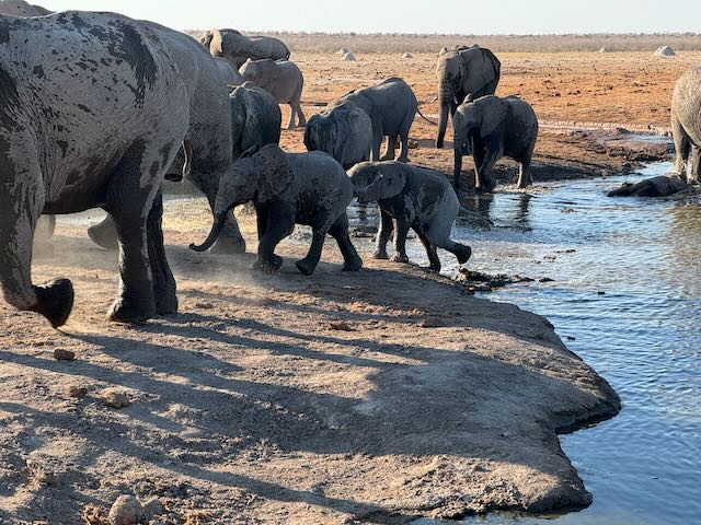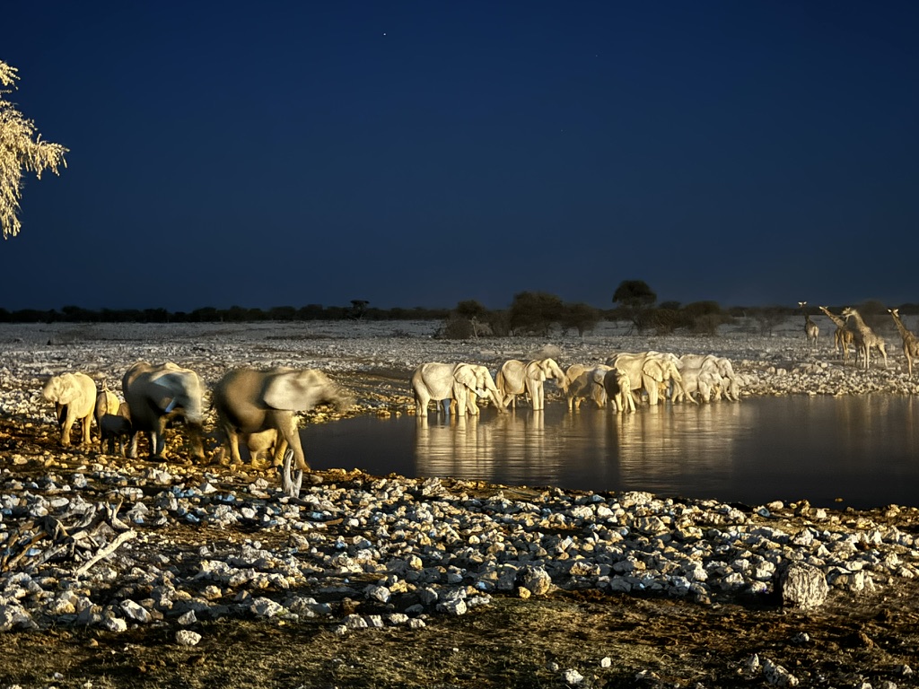 Next we drove North to Etosha, spending the first night in okaukuejo where we were blessed with 50+ elephants quietly slinking into the water hole just outside our cabin. We also saw giraffes, rhinos and different antelopes there that night. We then drove all the way across the park to the east side where we stayed a beautiful private safari camp called King Nehale. We stayed there two nights and did a couple more game drives. It was a great trip for all, but particularly for Brittany and Terri who had never been on an African safari.
