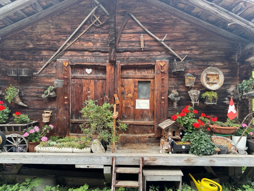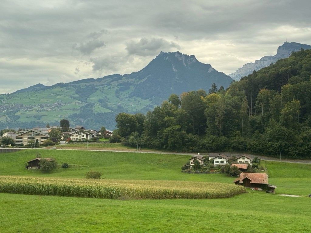 Now on the train from Geneva > Bern > Interlaken Ost > Lauterbrunnen > Grutschalp > Murren. Several trains, a cable car and some hoofing the last 1/2 mile as cars are not allowed in Murren. The countryside started beautiful and turned stunning as we entered the mountains.