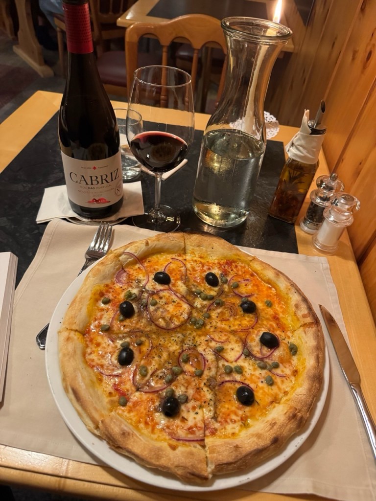 When I get back to the hotel for my 7:00 dinner reservation, the lady that seemed to be in charge was on the phone. And she was hopping. It was busy. Someone was apparently calling about a pizza to go and she curtly said ‘tonight it is 8 francs more because we are busy.’ Remarkably, that did not end the conversation. She rattled off some pizza topping options and took an order and hung up.
