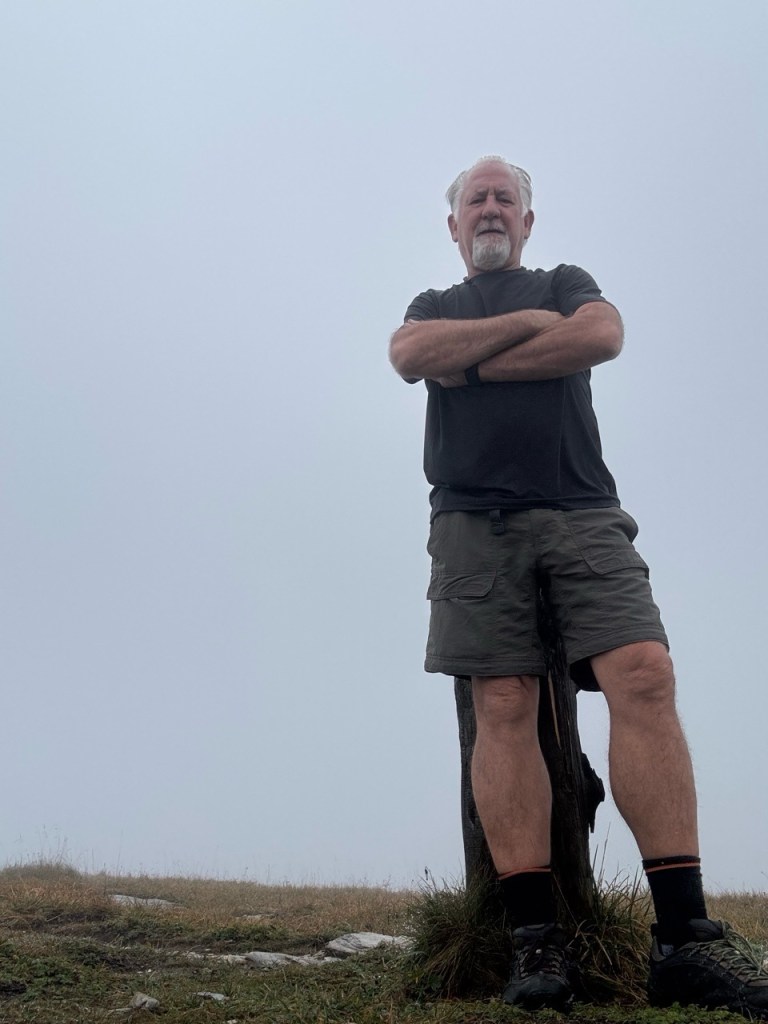 Big hike today. Almost more than I had in me. But I am nothing if not stubborn. Somewhere around 4,400 feet of vertical over 16 miles. I think the average grade for most of the climb was near 10% or so. At the top, the last 500 or 600 yards, the grade is close to 20%. It was foggy and misty so the rocks and trail were slippery as ice, so scrambling those last yards felt pretty dangerous. If I slipped and fell, it was likely I would not stop rolling until I hit a tree or a cow — and I was way above the tree line.